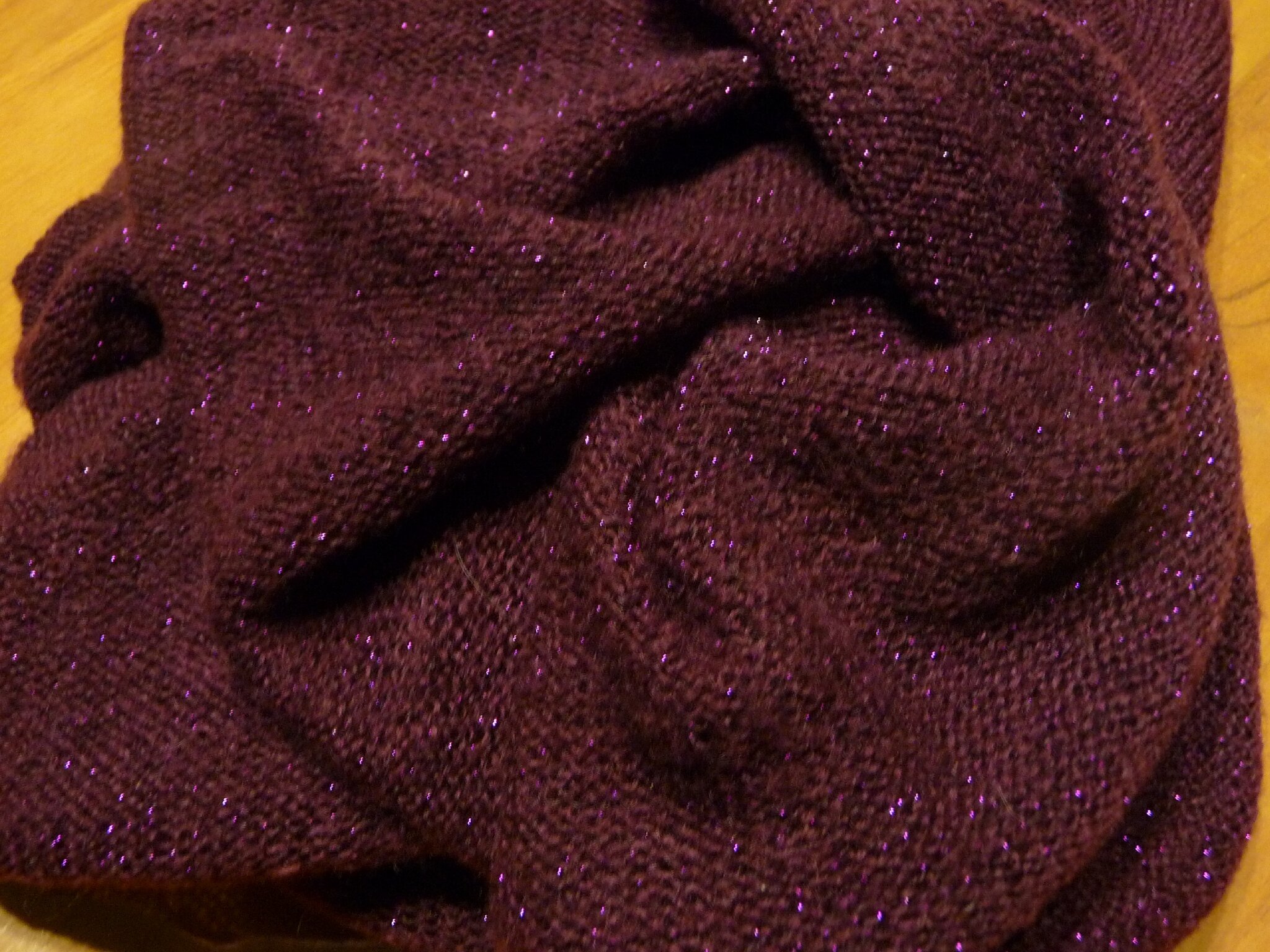 J'ai aussi pu mesurer l'importance de bien choisir la couleur de mes vêtement, bijoux. J'ai acheté un foulard il y a quelques temps mais les jours suivants j'ai trouvé que sa couleur (un bleu vert) et son motif associés à mon poivre et sel me vieillissaient, tandis que je trouve que mon écharpe "tube" en maille fine violine avec des paillettes fuchsia me va bien. Je vous la montre en photo, le rendu n'est pas tout à fait fidèle, mais on n'est pas trop loin.